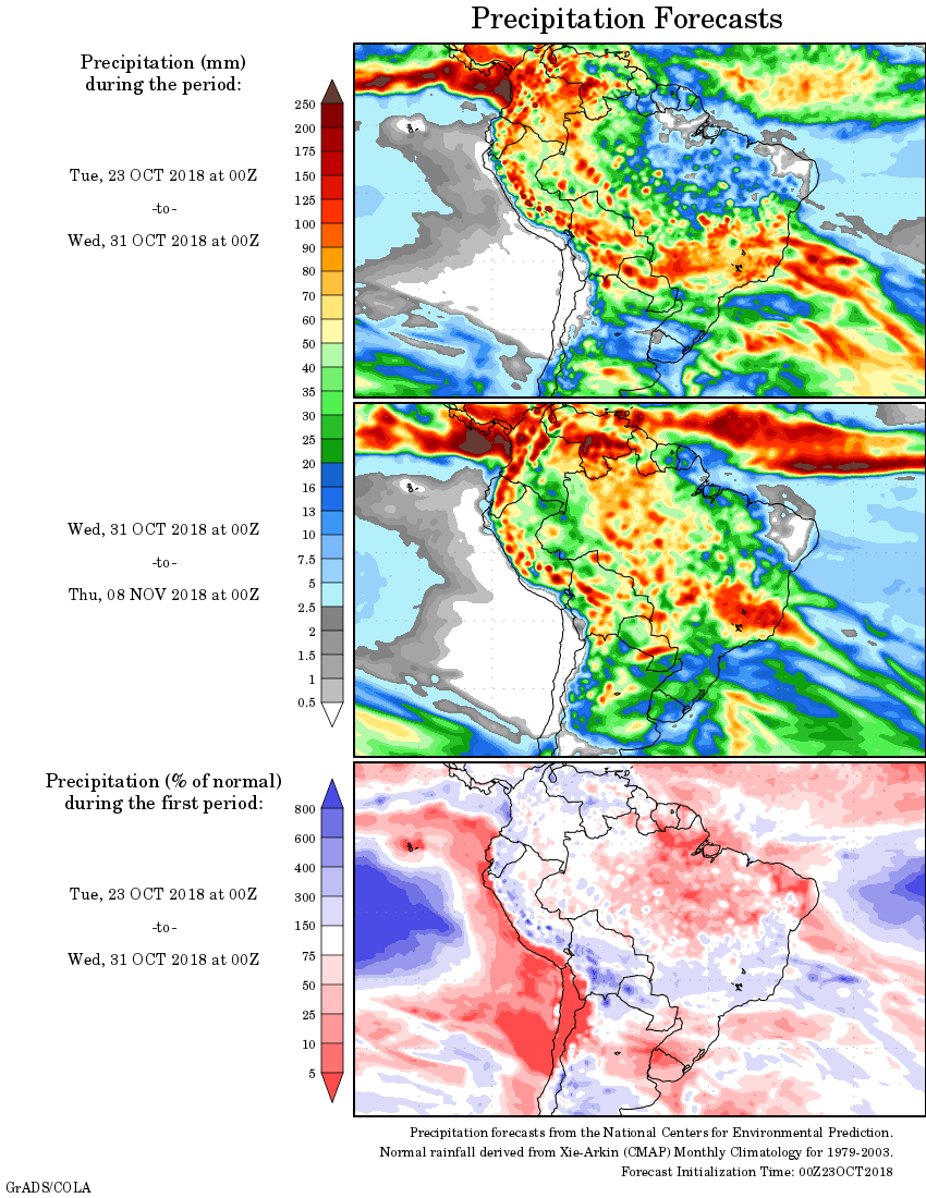 Mapas estendidos do centro de previsão da Administração Oceânica e Atmosférica Nacional (NOAA, na sigla em inglês), nos Estados Unidos, mostram a tendência de chuvas mais concentradas sobre a faixa Central do país entre os dias 22 a 30 de outubro. Entre 30 de outubro e 7 de novembro, uma condição mais úmida toma diversas áreas Centrais e mais ao Norte e Nordeste do país.