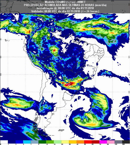 De acordo com dados de precipitação acumulada do Inmet, diversas cidades da região Sul do Brasil tiveram altos acumulados ontem (31). Os cinco maiores foram registrados em São Luiz Gonzaga (RS): 82,2 mm, Santiago (RS): 81,8 mm, Alegrete (RS): 79,6 mm, São Luiz Gonzaga (RS): 79,4 mm e Santa Rosa (RS): 71,4 mm.
