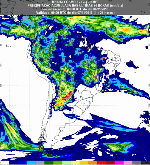 Veja o mapa com precipitação acumulada nas últimas 24 horas em todo o Brasil: