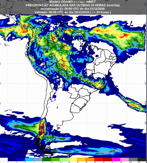 Veja o mapa de precipitação acumulada nas últimas 24 horas em todo o Brasil: