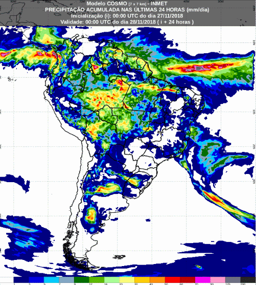 Veja o mapa de precipitação acumulada nas últimas 24 horas em todo o Brasil: