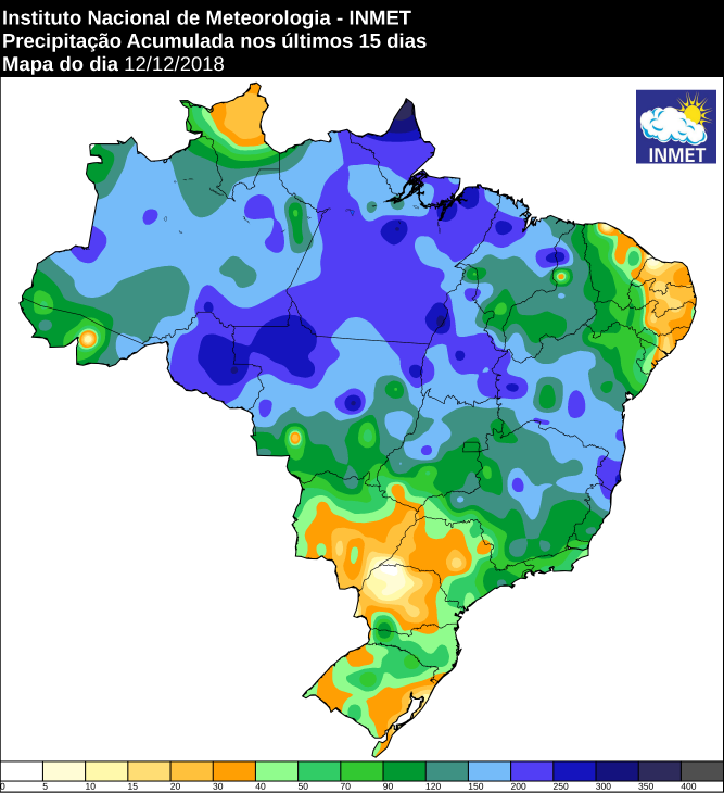 Veja o mapa de precipitação acumulada nos últimos 15 dias em todo o Brasil: