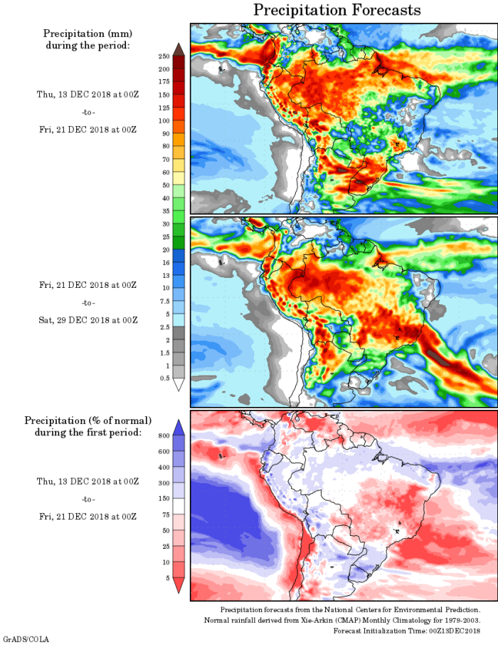 Segundo modelos estendidos do centro de previsão da Administração Oceânica e Atmosférica Nacional (NOAA, na sigla em inglês), as precipitações ficarão concentradas sobre o Norte e partes do Sudeste e extremo Sul de 13 a 21 de dezembro. De 21 a 29 desse mês, os acumulados seguem nessa faixa, mas aparecem com mais força no extremo Norte do país e avança mais ao centro da região Sul e Sudeste.