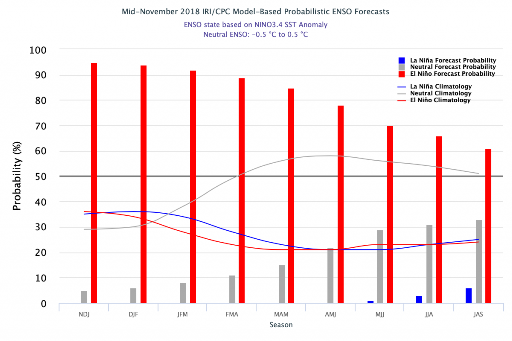 O Centro de Previsão Climática do NOAA (Administração Oceânica e Atmosférica Nacional) dos Estados Unidos aponta chances de ocorrência de El Niño próxima de 90% no verão do hemisfério Norte e cerca de 60% no nosso outono, ainda como um fenômeno de fraca intensidade.