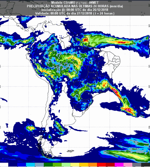 Previsões estendidas do centro de previsão da Administração Oceânica e Atmosférica Nacional (NOAA, na sigla em inglês), mostram que entre os dias 26 de dezembro e 03 de janeiro, as precipitações ficarão concentradas sobre Centro-Norte do país. De 03 a 11 de janeiro, as chuvas ficarão mais concentradas no Sul.