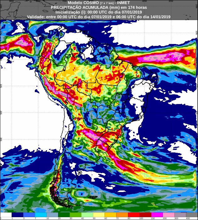 Veja o mapa com a previsão de precipitação acumulada para até 174 horas (08/01 a 14/01) em todo o Brasil: