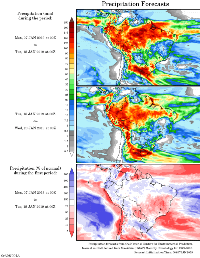 Veja o mapa com a tendência de precipitação acumulada para o período de 07 de janeiro até 15 de janeiro: