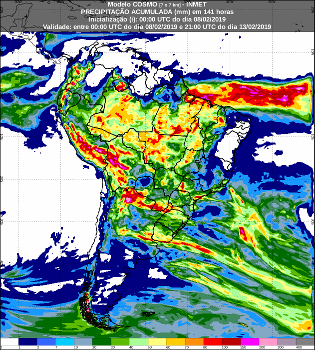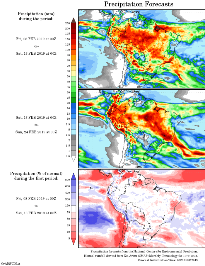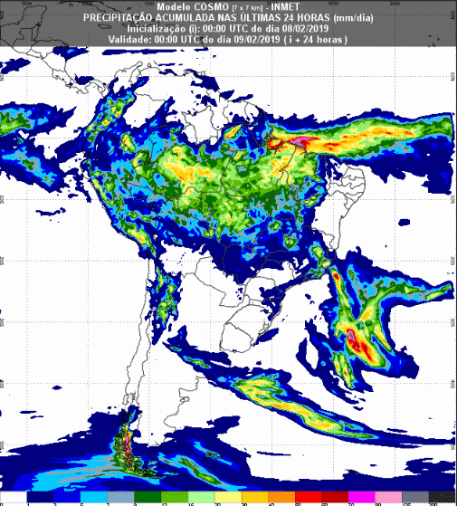 Mapas estendidos, do centro de previsão da Administração Oceânica e Atmosférica Nacional (NOAA, na sigla em inglês), apontam que no período de 08 de fevereiro até 16 de fevereiro, as chuvas volumosas ficarão concentradas sobre a região Centro-Norte do país, com destaque para áreas do Norte, Centro-Oeste, Sudeste e Sul.
