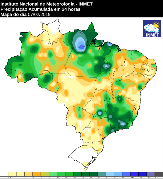 Nas últimas 24 horas, segundo levantamento do Inmet, as precipitações mais volumosas pelo país estiveram mais concentradas sobre o Centro-Norte. Os cinco maiores volumes foram registrados em Tracuateua (PA): 92,6 mm, Monte Alegre (PA): 90,6 mm, Marambaia (RJ): 89,8 mm, Coronel Pacheco (MG): 88,0 mm e Rio de Janeiro (RJ): 84,6 mm.