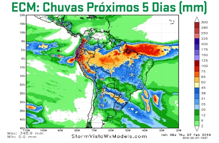 "A rodada de chuvas é tida como altamente benéfica para a manutenção dos níveis de umidade nas regiões de início da safrinha e as demais regiões que ainda cultivam a primeira safra do ano. Em Minas Gerais, Goiás, Mato Grosso e todo o MATOPIBA as precipitações também são mantidas para os próximos 5 dias", reportou a ARC Mercosul (AgResource).