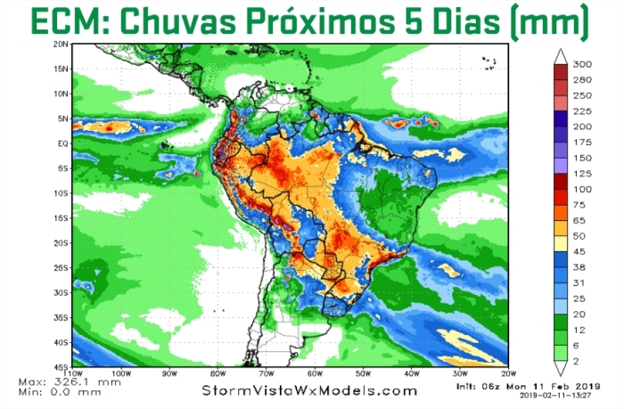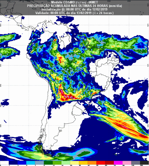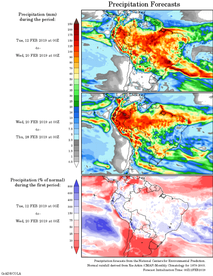 Em uma previsão mais estendida, do centro de previsão da Administração Oceânica e Atmosférica Nacional (NOAA, na sigla em inglês), apontam que no período de 12 de fevereiro até 20 de fevereiro, quase todo o país receberá chuvas volumosas, com exceção de áreas ao Sul e do Matopiba.