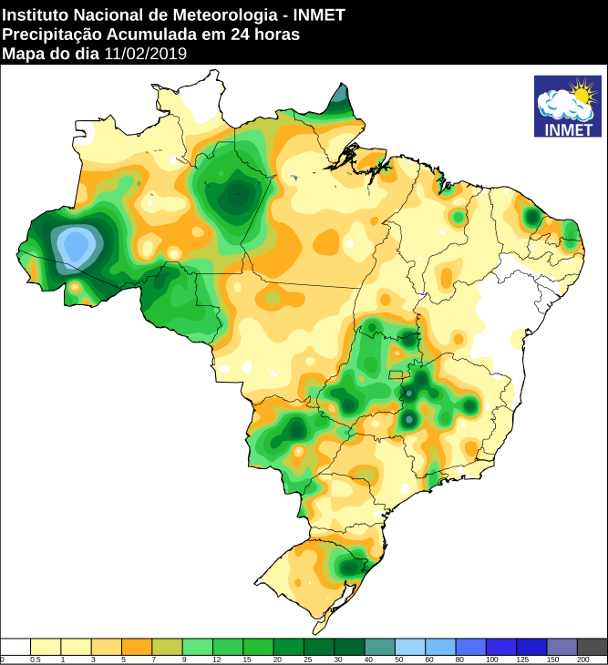 Nas últimas 24 horas, segundo levantamento do Inmet, as precipitações mais volumosas pelo país estiveram concentradas sobre o Centro-Norte. Os cinco maiores volumes ocorreram em Divinópolis (MG): 117,4 mm, Feijó (AC): 82,0 mm, São Gabriel do Oeste (MS): 75,0 mm, Eirunepe (AM): 71,2 mm e Paracatu (MG): 64,0 mm.