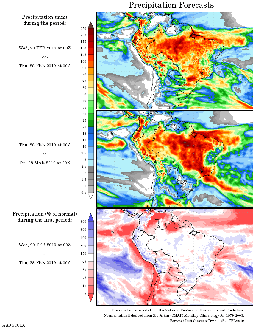 Em uma previsão mais estendida, do centro de previsão da Administração Oceânica e Atmosférica Nacional (NOAA, na sigla em inglês), no período de 20 de fevereiro até 28 de fevereiro, chuvas volumosas se concentram no Centro-Norte, mas chove por quase todo o país.