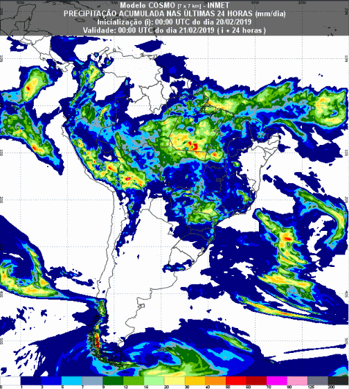Em uma previsão mais estendida, do centro de previsão da Administração Oceânica e Atmosférica Nacional (NOAA, na sigla em inglês), no período de 20 de fevereiro até 28 de fevereiro, chuvas volumosas se concentram no Centro-Norte, mas chove por quase todo o país.