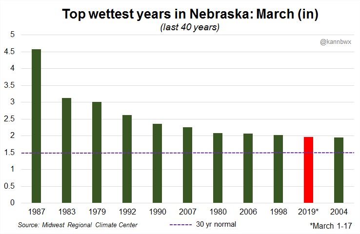 O governador de Nebraska, Pete Ricketts, já declarou estado de emergência. O estado registra seu maio mais chuvoso em mais de 100 anos e 2019 já é um dos anos mais chuvosos dos últimos 40. O gráfico de Karen Braun, uma especialista da Reuters Internacional, ilustra essa situação, com dados do Midwesr Regional Climate Center.