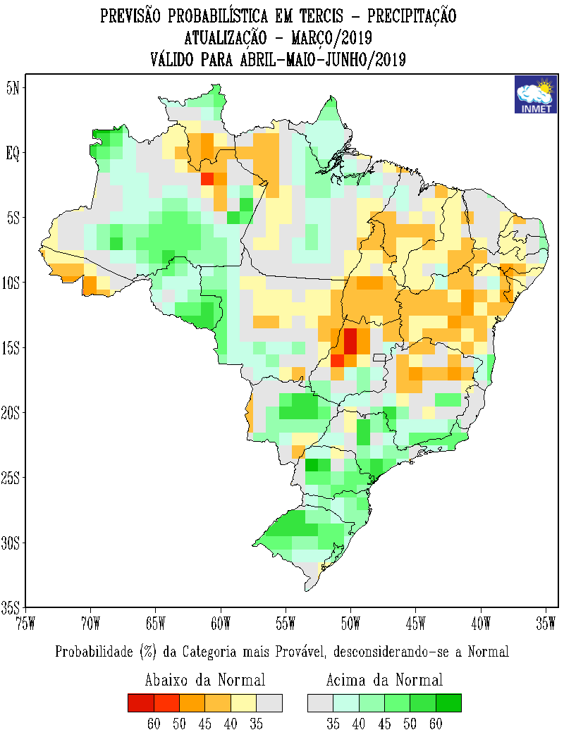 Veja o mapa de previsão probabilística para todo o Brasil em abril, maio e junho: