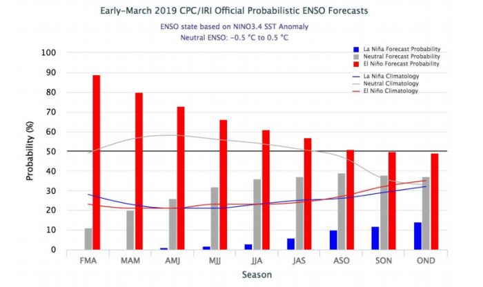 "Os modelos de previsão climática, gerados pelos principais centros internacionais de Meteorologia, indicam, com uma probabilidade superior a 70%, que o início do outono de 2019 será marcado pela atuação do fenômeno El Niño de fraca intensidade até o início do inverno do hemisfério sul. Esta situação contribui, para que os impactos sobre a precipitação e temperatura no Brasil, não ocorram de forma generalizada e significativa", disse o Inmet.