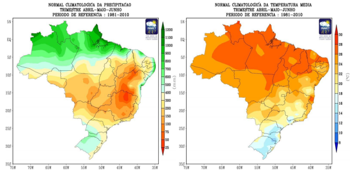 Veja a climatologia de temperatura média e precipitação para o trimestre abril, maio e junho. Período de referência: 1981 – 2010: