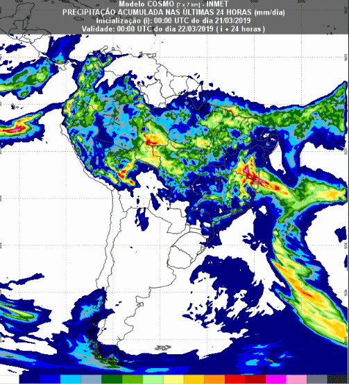 De acordo com o mapa de previsão estendida do centro de previsão da Administração Oceânica e Atmosférica Nacional (NOAA, na sigla em inglês), no período de 21 até 29 de março, as chuvas mais volumosas caem sobre áreas da faixa Centro-Norte do país, incluindo áreas do Matopiba.