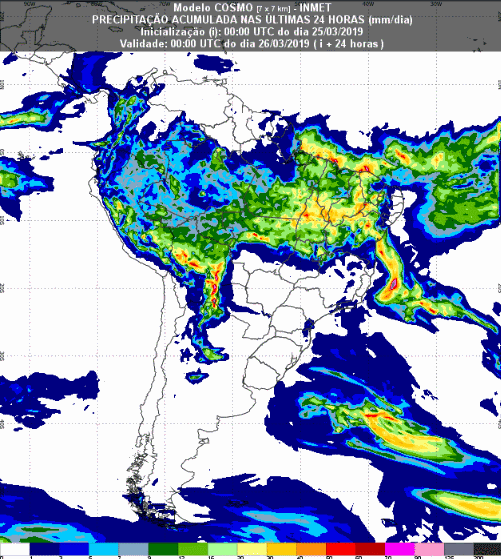 Veja o mapa com a previsão de precipitação acumulada para até 72 horas (26/03 a 28/03) em todo o Brasil: