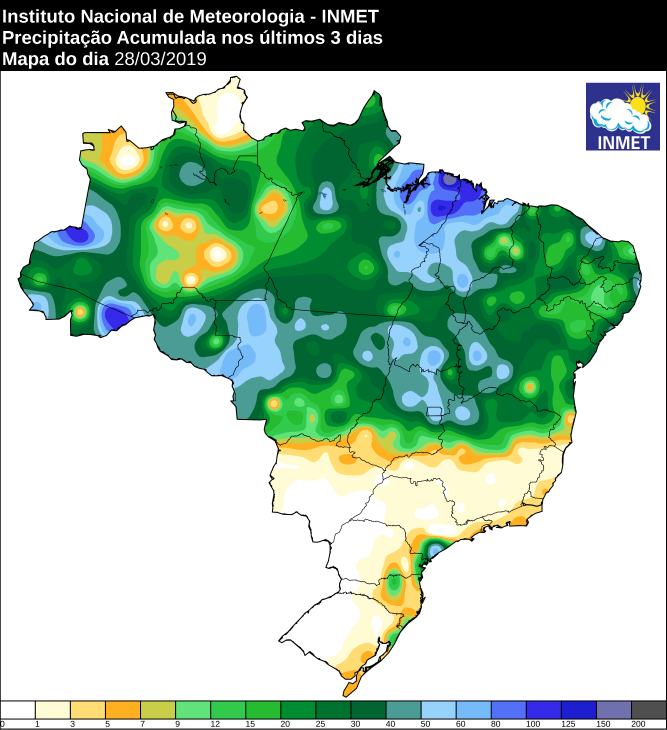 No mapa de precipitação acumulada dos últimos três dias é possível ver que as chuvas mais volumosas no país seguem concentradas no Centro-Norte. Os cinco maiores acumulados na quinta foram registrados em Benjamin Constant (AM): 133,0 mm, São Sebastião (SP): 91,0 mm, Iguapé (SP): 83,4 mm, Cotriguaçú (MT): 73,0 mm e Rio Branco (AC): 70,5 mm.