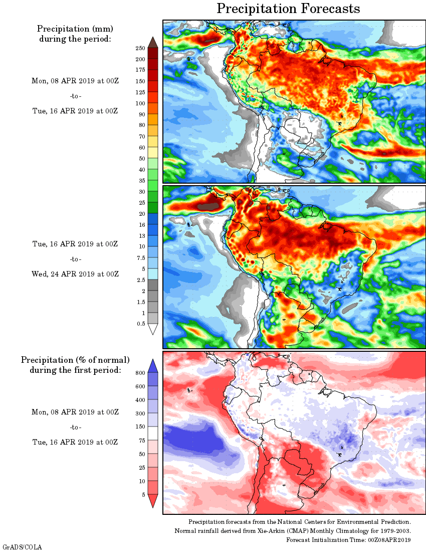 De acordo com o mapa de previsão estendida do centro de previsão da Administração Oceânica e Atmosférica Nacional (NOAA, na sigla em inglês), no período de 08 até 16 de abril, as chuvas mais volumosas caem sobre áreas da faixa Centro-Norte do país.