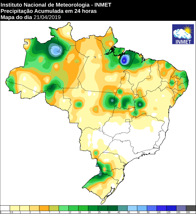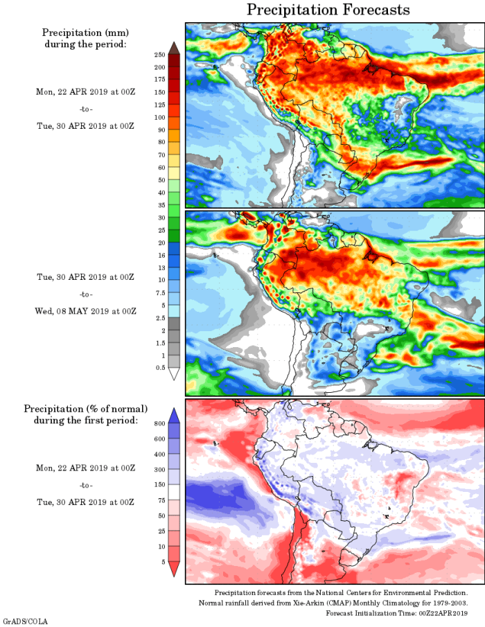 De acordo com o mapa de previsão estendida do centro de previsão da Administração Oceânica e Atmosférica Nacional (NOAA, na sigla em inglês), no período de 22 até 30 de abril, as chuvas mais volumosas caem sobre áreas da faixa Centro-Norte do país, mas voltam para outras áreas, incluindo o Sul.