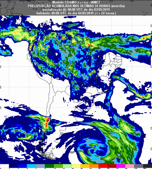 Em uma previsão estendida, para os próximos sete dias, de 03 até 10 de maio, o modelo Cosmo do Inmet aponta registro de acumulados expressivos sobre o Sul, principalmente no Rio Grande do Sul e Santa Catarina, apesar de também chover sobre o Paraná. Em áreas centrais, as chuvas ocorrerão, mas menos volumosas.