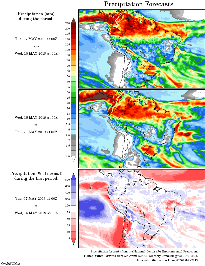 De acordo com o mapa de previsão estendida do centro de previsão da Administração Oceânica e Atmosférica Nacional (NOAA, na sigla em inglês), no período de 07 até 15 de maio, as chuvas mais volumosas caem sobre áreas da faixa Norte do país, mas voltam em áreas do Sul.