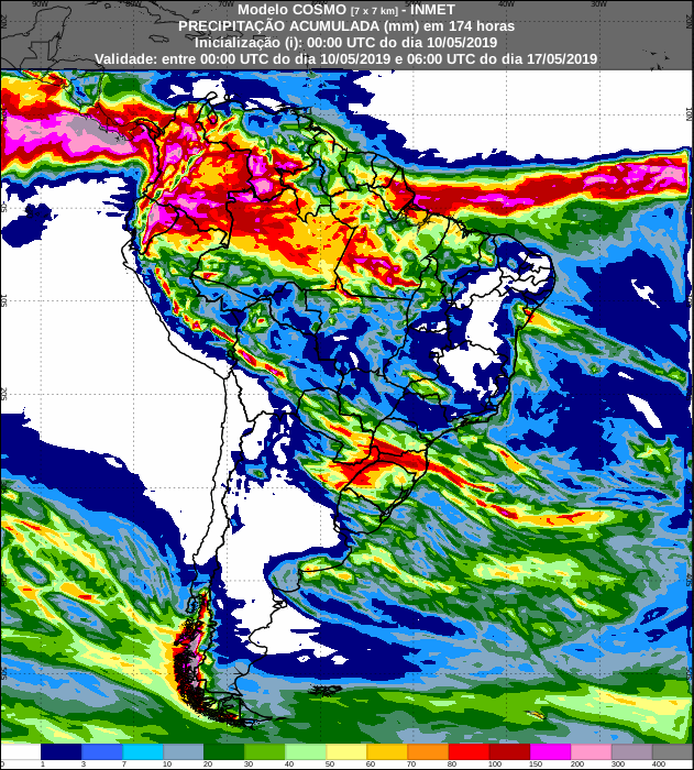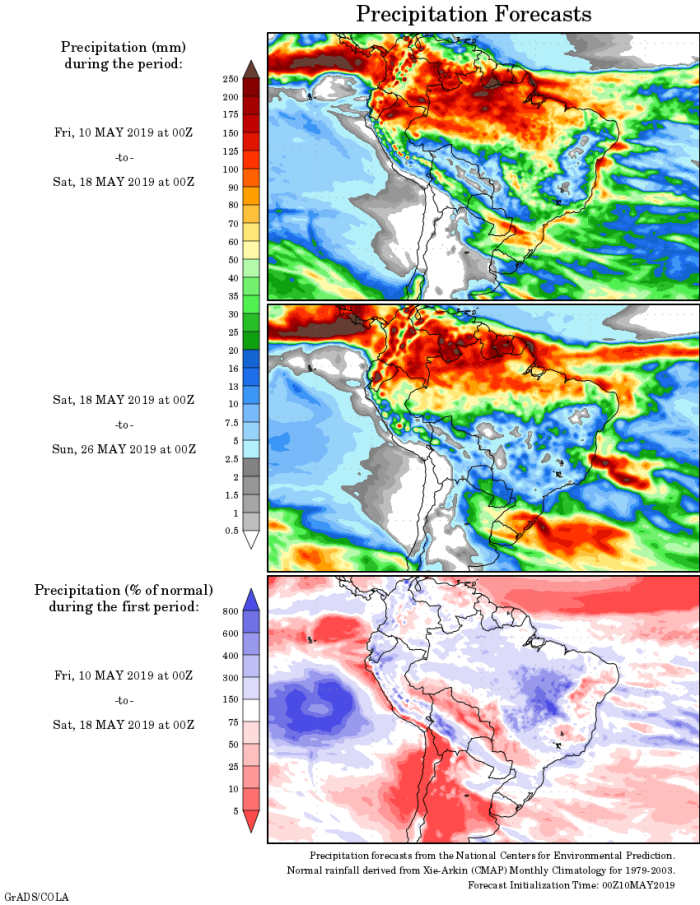 De acordo com o mapa de previsão estendida do centro de previsão da Administração Oceânica e Atmosférica Nacional (NOAA, na sigla em inglês), no período de 10 até 18 de maio, as chuvas mais volumosas caem sobre áreas da faixa Norte do país, mas voltam ao Sul e pontos centrais.
