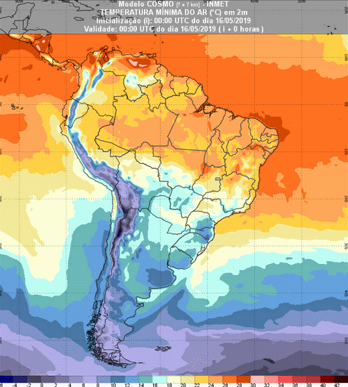 Veja o mapa com a previsão de temperatura mínima para até 93 horas (17/05 a 19/05) em todo o Brasil: