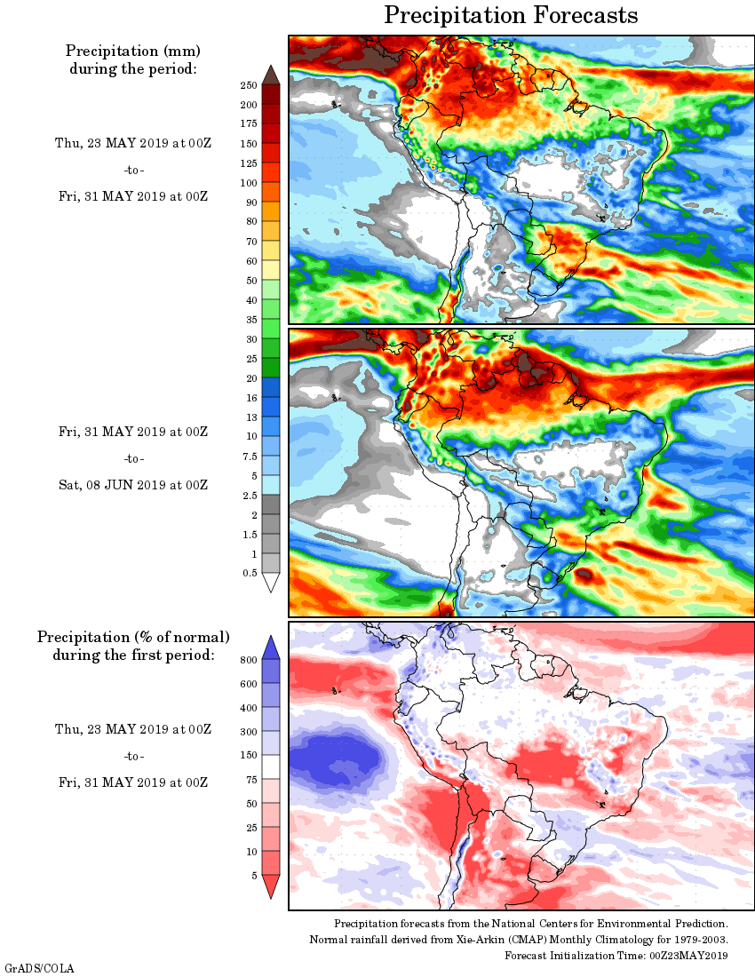 De acordo com o mapa de previsão estendida do centro de previsão da Administração Oceânica e Atmosférica Nacional (NOAA, na sigla em inglês), no período de 24 até 01 de junho, as chuvas mais volumosas caem sobre áreas da faixa Norte do país, mas também ocorrem em áreas da região Sul.