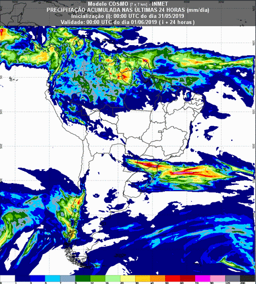 O modelo do centro de previsão da Administração Oceânica e Atmosférica Nacional (NOAA, na sigla em inglês), mais estendido, prevê que no período de 31 de maio até 08 de junho, as chuvas mais volumosas ainda ocorrem sobre áreas do Norte e pontos do Sul e Sudeste do país.