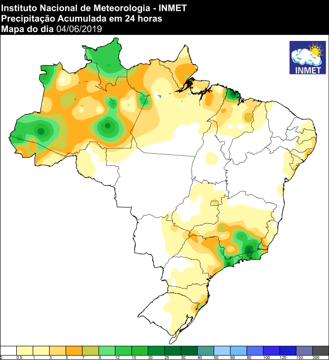 Mapa de precipitação acumulada nas últimas 24 horas em todo o Brasil - Fonte: Inmet