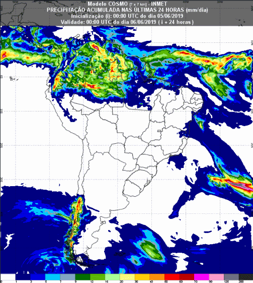 Veja o mapa com a previsão de precipitação para até 93 horas (06/06 a 08/06) em todo o Brasil: