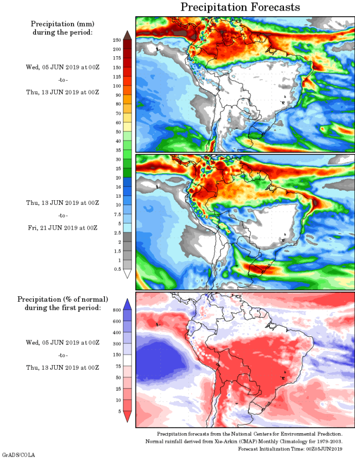 Mapa com a tendência de precipitação acumulada para o período de 05 até 21 de junho - Fonte: National Centers for Environmental Prediction/NOAA