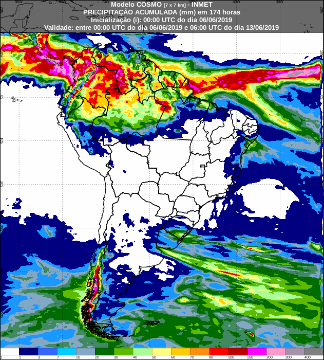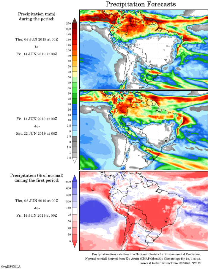 De acordo com o mapa de previsão estendida do centro de previsão da Administração Oceânica e Atmosférica Nacional (NOAA, na sigla em inglês), no período de 06 até 14 de junho, as chuvas mais volumosas caem sobre áreas da faixa Norte do país, mas também voltam ao Sul.