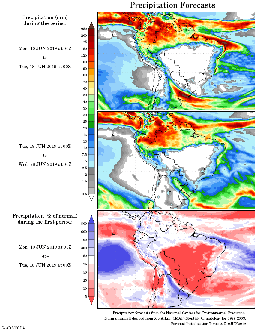 De acordo com o mapa de previsão estendida do centro de previsão da Administração Oceânica e Atmosférica Nacional (NOAA, na sigla em inglês), no período de 10 até 18 de junho, as chuvas mais volumosas caem sobre áreas da faixa Norte do país, mas também voltam ao Sul.