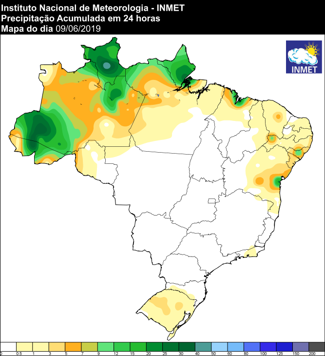 O mapa de precipitação acumulada do Inmet nas últimas 24 horas aponta que os maiores volumes de chuva pelo país foram registrados no Norte e em pontos das regiões Nordeste e Sul, mas com volumes bastante baixos.