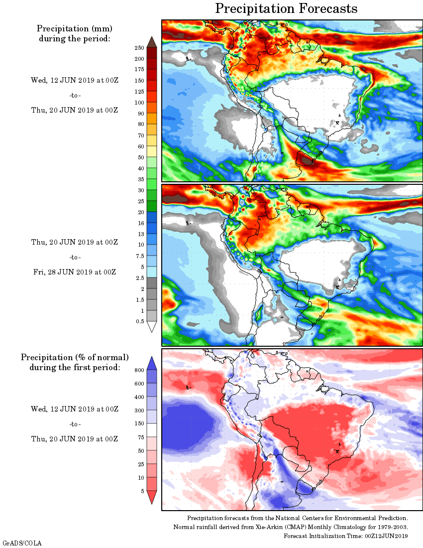Mapas mais estendidos, do centro de previsão da Administração Oceânica e Atmosférica Nacional (NOAA, na sigla em inglês), no período de 12 até 20 de junho, mostram a tendência de que as chuvas avancem sobre todo o Sul no período. No Norte, as precipitações continuarão.