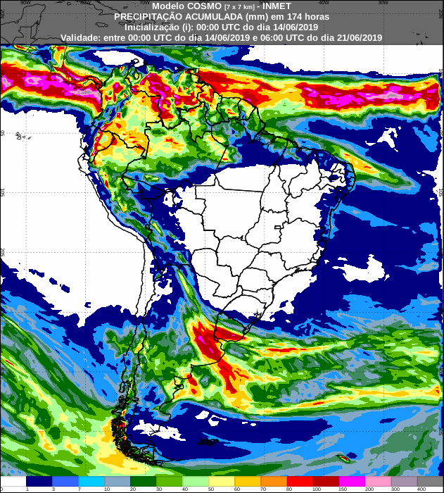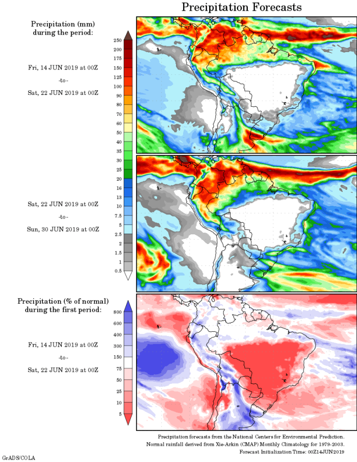De acordo com o mapa de previsão estendida do centro de previsão da Administração Oceânica e Atmosférica Nacional (NOAA, na sigla em inglês), no período de 14 até 22 de junho, as chuvas mais volumosas caem sobre áreas da faixa Norte do país, mas também voltam ao Sul.