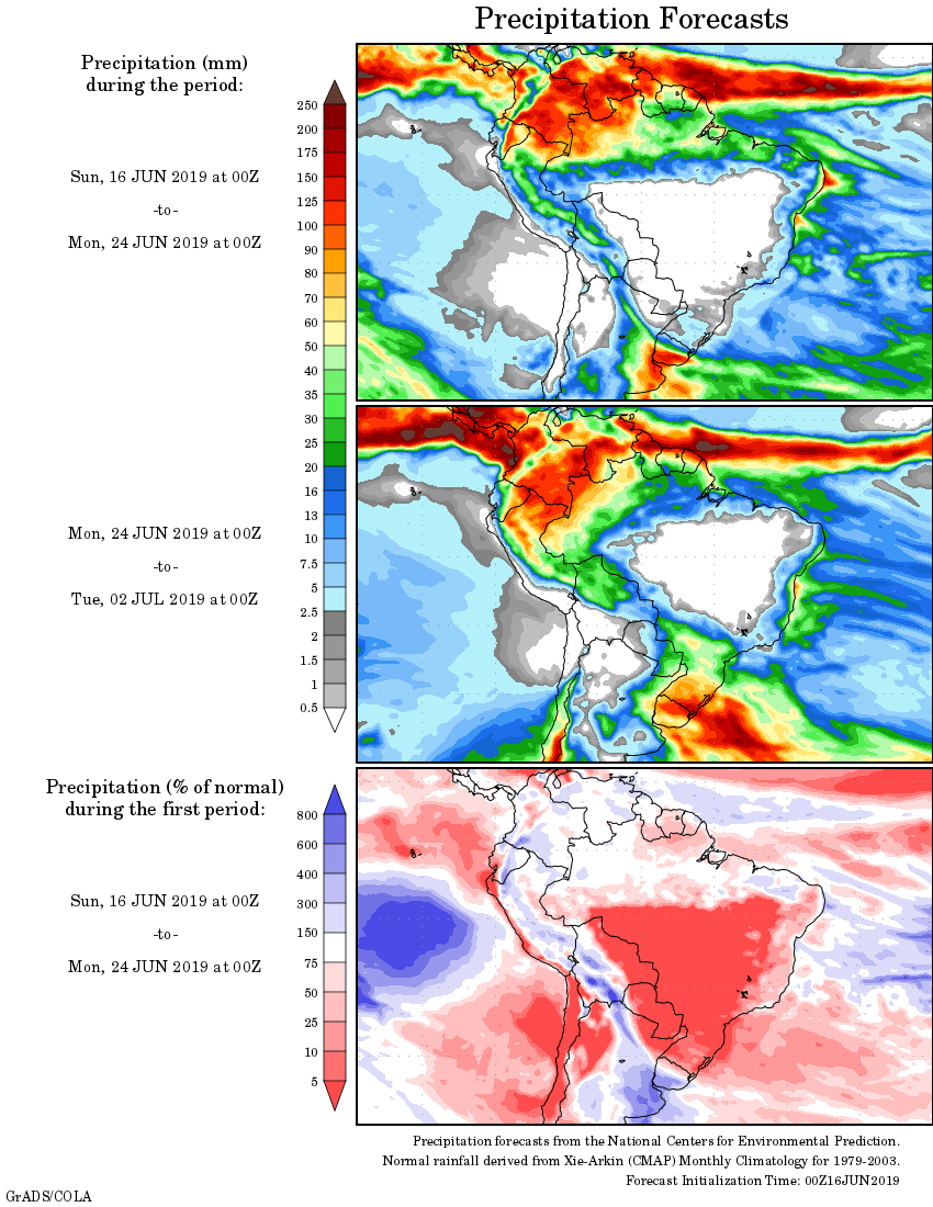 De acordo com o mapa de previsão estendida do centro de previsão da Administração Oceânica e Atmosférica Nacional (NOAA, na sigla em inglês), no período de 16 até 24 de junho, as chuvas mais volumosas caem sobre áreas da faixa Norte do país, mas também voltam leves ao Sul.