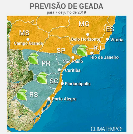 Veja o mapa das áreas com previsão de geada no dia 07 de julho: