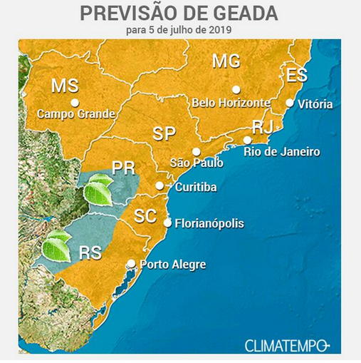 Veja o mapa das áreas com previsão de geada no dia 05 de julho: