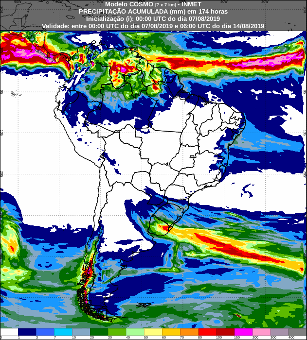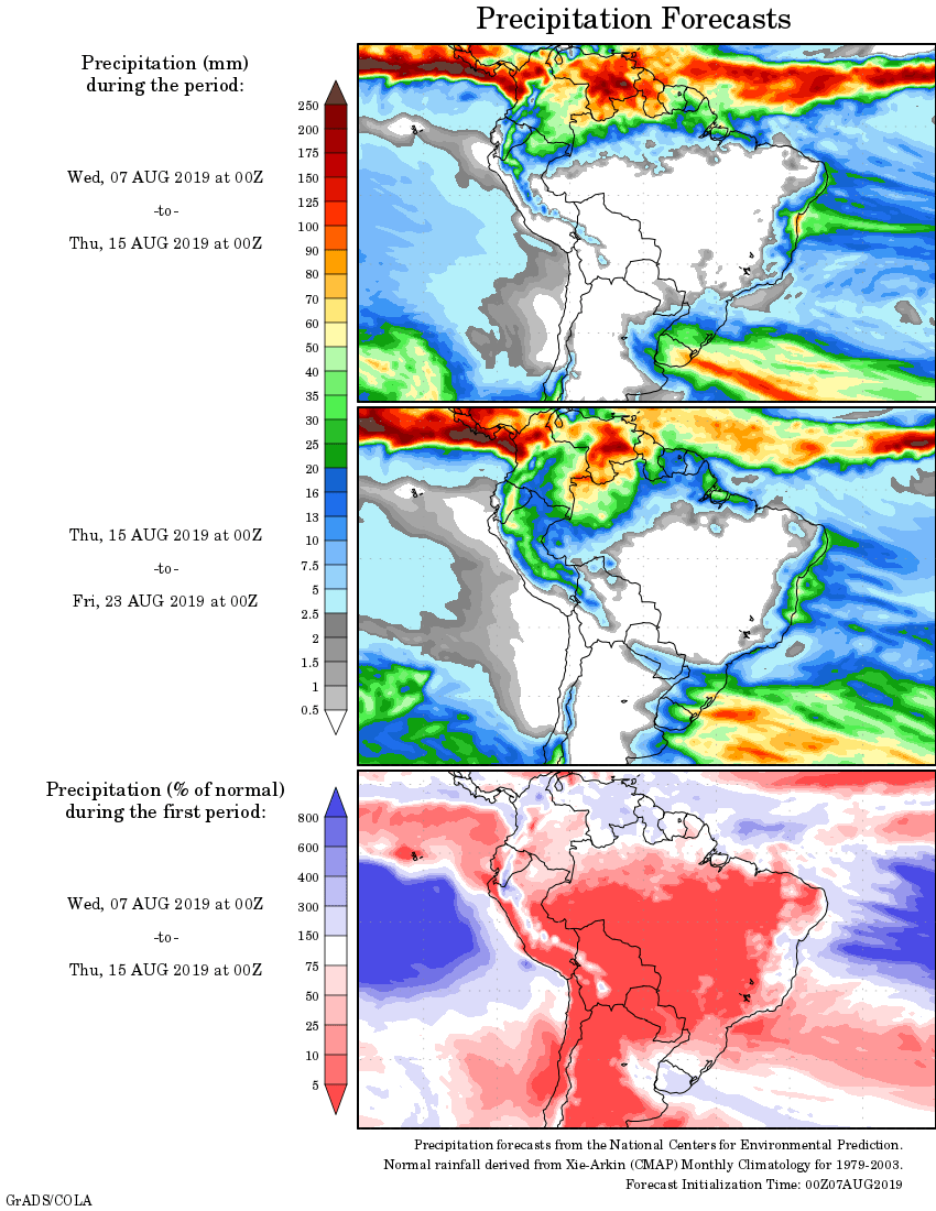 De acordo com o mapa de previsão estendida do centro de previsão da Administração Oceânica e Atmosférica Nacional (NOAA, na sigla em inglês), no período de 07 até 15 de agosto, as chuvas mais volumosas caem sobre as extremidades Norte, Sul e Nordeste do país, mas em volumes baixos a moderados.