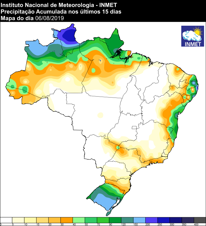 O mapa de precipitação acumulada do Inmet mostra que nos últimos 15 dias as chuvas mais volumosas se concentraram justamente nas áreas onde deve seguir chovendo nos próximos dias, extremo Sul, Norte e áreas do Nordeste. A maior parte da região central do país tem volumes próximos de zero.