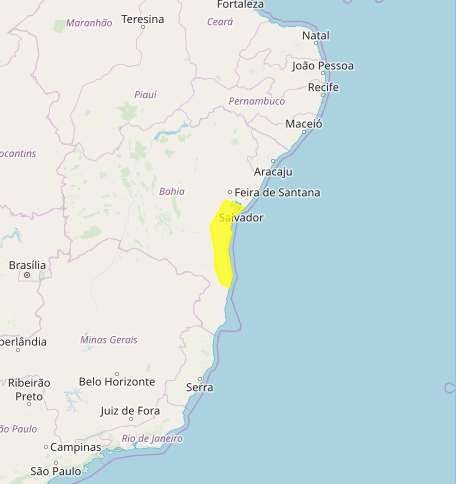 "Chuva entre 20 a 30 mm/h ou até 50 mm/dia. Baixo risco de alagamentos e pequenos deslizamentos, em cidades com tais áreas de risco", destacou o instituto meteorológico brasileiro nesta sexta-feira. O aviso vale para áreas do Sul Baiano, Recôncavo Baiano e Sudoeste Baiano.