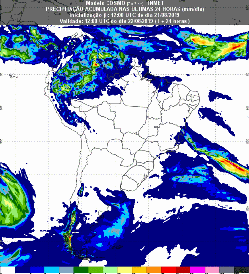 De acordo com o mapa de previsão estendida do centro de previsão da Administração Oceânica e Atmosférica Nacional (NOAA, na sigla em inglês), no período de 21 até 29 de agosto, as chuvas mais volumosas caem sobre as extremidades do país, com altos volumes no Norte e baixos a moderados acumulados no Sul e áreas do litoral Leste brasileiro.