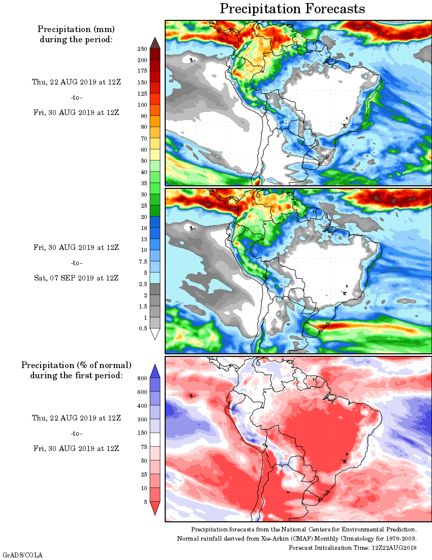 De acordo com o mapa de previsão estendida do centro de previsão da Administração Oceânica e Atmosférica Nacional (NOAA, na sigla em inglês), no período de 22 até 30 de agosto, as chuvas mais volumosas caem sobre as extremidades do país, com altos volumes no Norte e baixos a moderados acumulados no Sul e áreas do litoral Leste brasileiro.