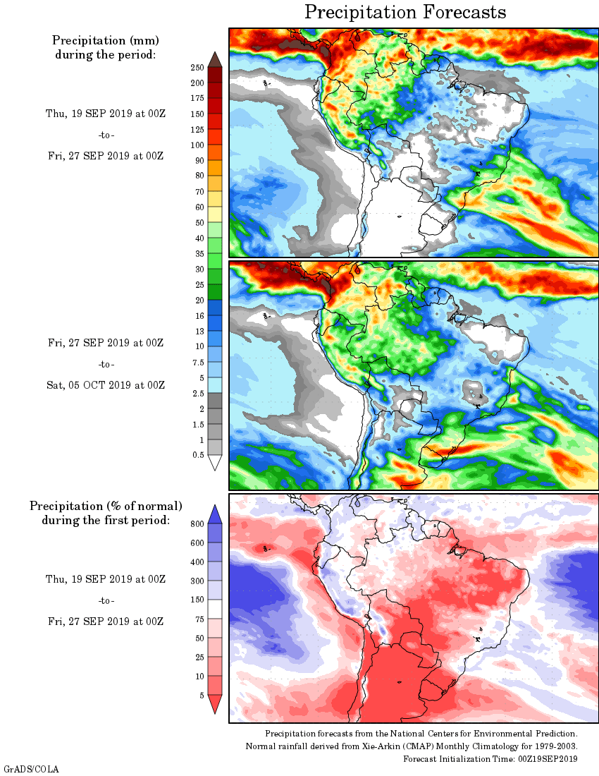 De acordo com o mapa de previsão estendida do centro de previsão da Administração Oceânica e Atmosférica Nacional (NOAA, na sigla em inglês), no período de 19 até 27 de setembro, as chuvas já começam a adentrar sobre áreas centrais do Brasil, ainda em que em baixos volumes. Altos acumulados seguem no Norte, Sul e partes do Sudeste.